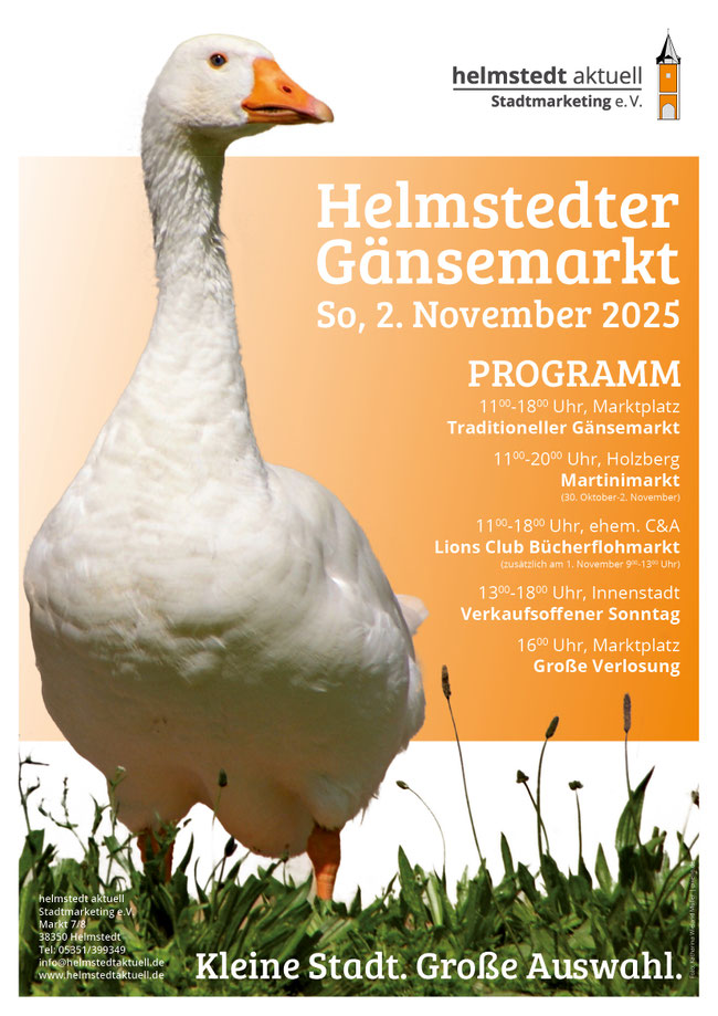 Der 24. Gänsemarkt am Sonntag, 2. November 2025, ist eine traditionsreiche Veranstaltung unseres Vereins helmstedt aktuell/Stadtmarketing e.V. in der historischen Altstadt, die alljährlich im Herbst stattfindet und Besucher aus der gesamten Region anlockt. Der von Fachwerkhäusern umgebene Marktplatz von Helmstedt ist an diesem Sonntag von 11:00 bis 18:00 Uhr der Mittelpunkt des Geschehens. Von 13:00 bis 18:00 Uhr haben außerdem die Geschäfte in der Innenstadt geöffnet.